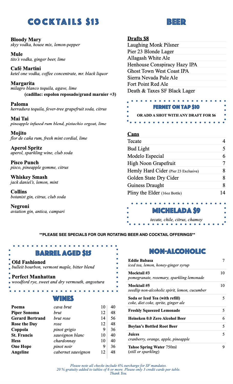 Thirty five years and counting, Pier 23 Cafe Restaurant & Bar is committed to preserving its rich San Francisco history. A destination spot for all those seeking a Classic City experience, we serve delicious food and cocktails right beside our beautiful San Francisco bay. As a family owned and operated small business, we create unique and intimate experiences. Our success is dependent on our relationships and local community. We take pride in our staff and purveyors, and in providing our customers quality product, service, and atmosphere.
