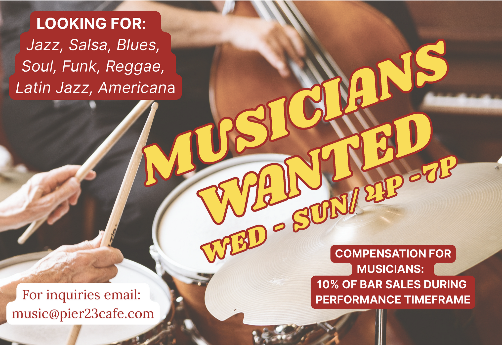 An artist from the Brazilian northeast, with over 40 years of musical experience, singer, composer, multi-instrumentalist, guitarist since childhood, Robson Batinga is a wonderful addition to our beautiful scenery. Join us at Pier 23 Cafe any Saturday afternoon from 2pm-5pm to relax and enjoy Robson’s vibes. We can’t wait to see you!